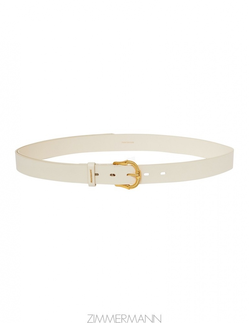 The Twisted Buckle Leather Belt 30 in Macadamia from our Resort 2024 Collection, Matchmaker. A leather belt featuring a twisted gold buckle and custom branding.- Waist belt
