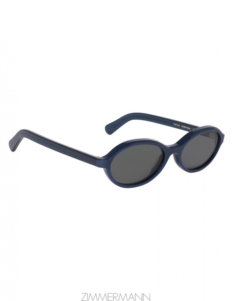 The Zimmermann Cyd Oval in Navy from our Spring 2024 Collection, Natura. An oversized oval shape sunglasses featuring a custom wire core suspended in a layered acetate with transparent surface.- Tonal lenses