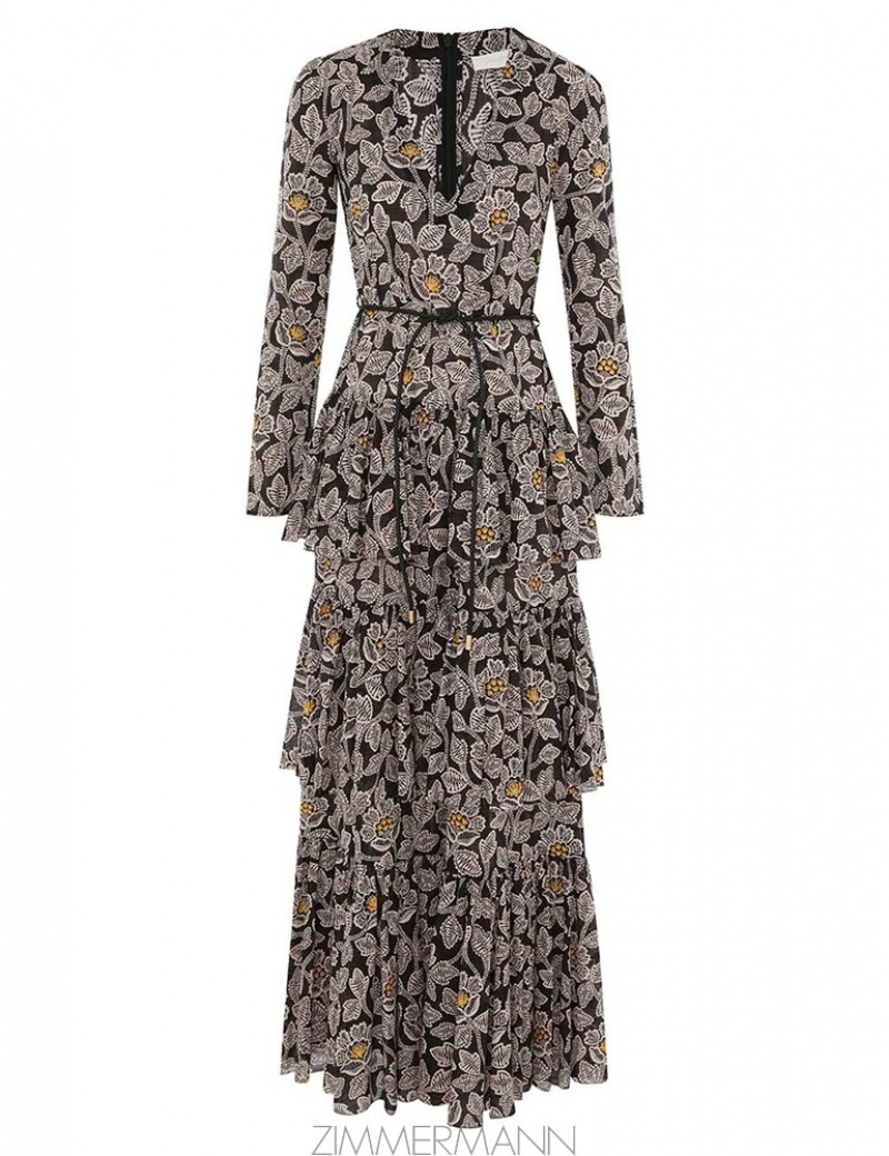 Black Floral Zimmermann Ottie Tiered Midi Dress Clothing