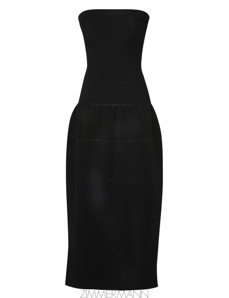 The Natura Panelled Midi Dress in Black from our Spring 2024 Collection, Natura. A strapless panelled midi dress featuring a fitted elongated corset finished with a drop waist gathered skirt.- Panelled strapless midi dress