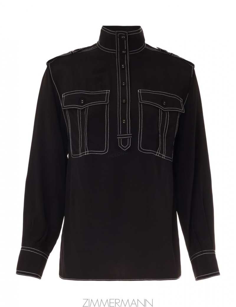 The Utility Blouse in Black from our Resort 2024 Collection, Matchmaker. A relaxed blouse featuring a utility silhouette, finished with a mandarin collar and contrast topstitching throughout.- Utility Blouse