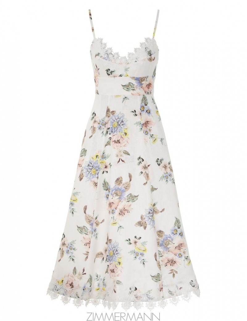 The Applique Picnic Dress in Blue Floral from our Resort 2024 Collection, Matchmaker. A linen midi dress featuring trims of lace applique throughout.- Linen midi dress