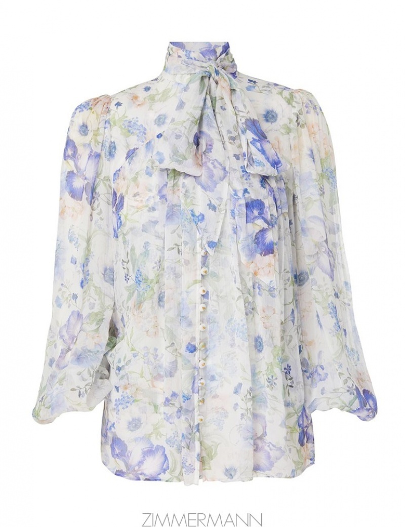 - Blue Garden Print Zimmermann Natura Tie Neck Billow Top Tops