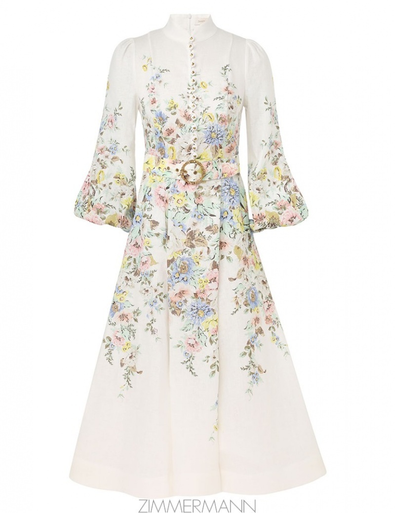 The Matchmaker Buttoned Midi Dress in Cream/Blue Floral from our Resort 2024 Collection, Matchmaker. A linen midi dress featuring a stand collar and exaggerated sleeves.- Linen midi dress