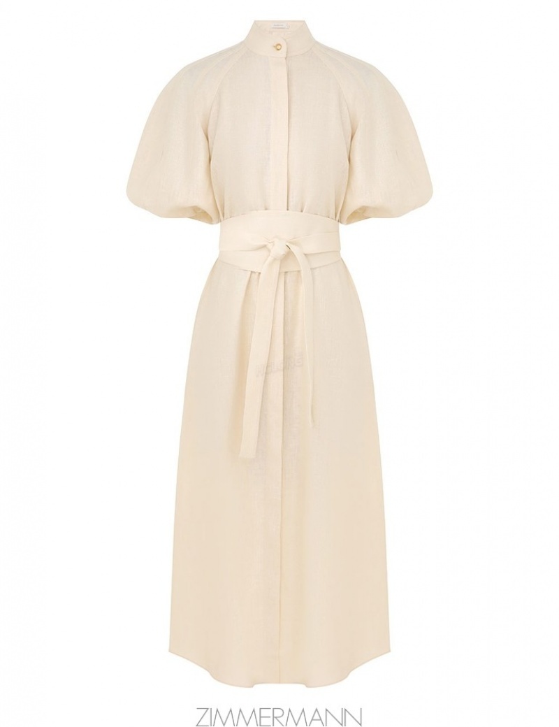 The Kaftan Midi in Cream from our Spring 2024 Collection, Natura. A relaxed linen kaftan featuring a stand collar, elasticated blouson sleeves and a removable tie belt .- Linen