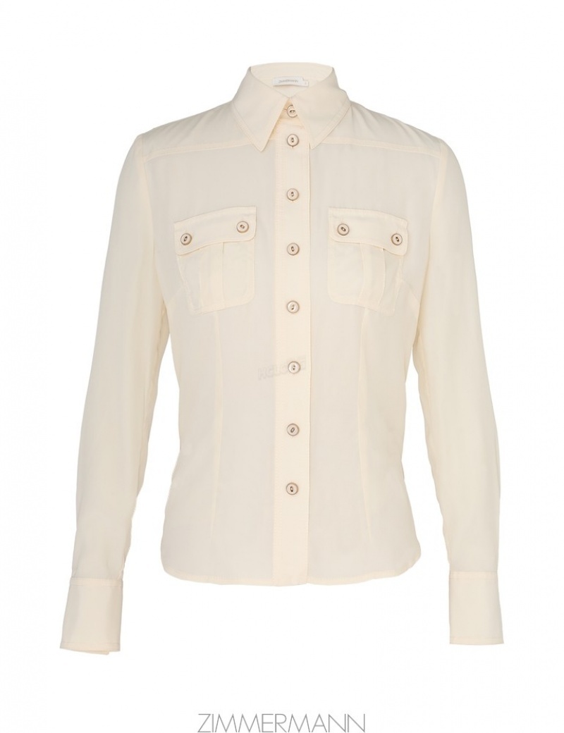 The Utility Body Shirt in Cream from our Spring 2024 Collection, Natura. A long sleeve blouse featuring a utility silhouette, chest pockets and a classic collar, finished with buttoned cuff sleeves.- Utility Blouse