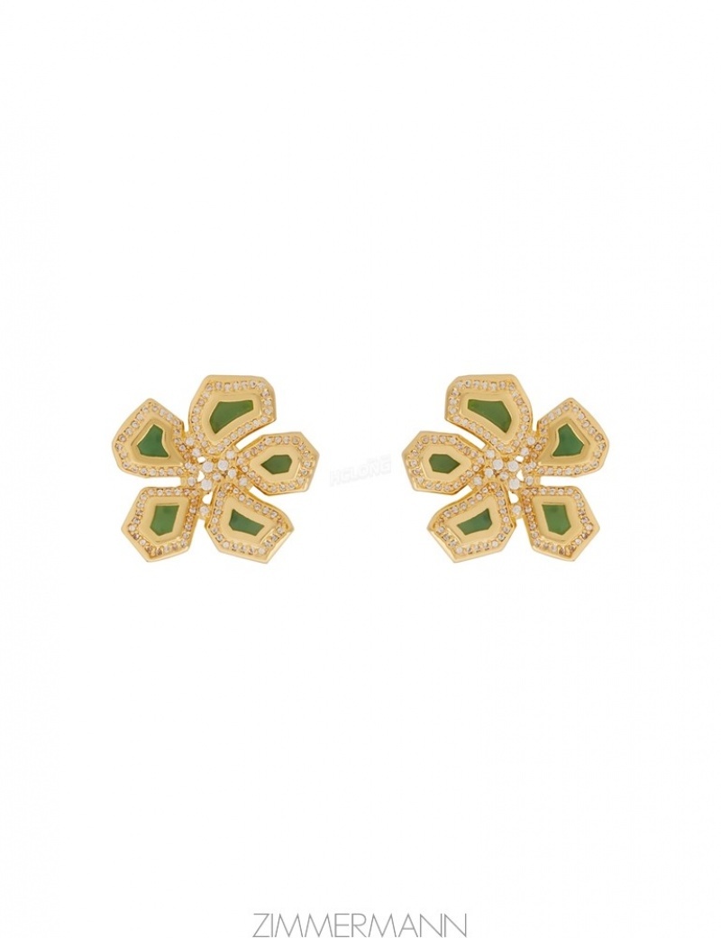 The Zimmermann Natura Studs in Gold/Agate from our Spring 2024 Collection, Natura. A gold plated stud earring featuring green agate and white cubic zirconia stones throughout.- 12KT gold plated brass