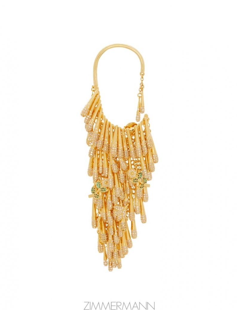 The Zimmermann Bloom Ear Cuff in Gold/Green from our Spring 2024 Collection, Natura. A gold plated ear cuff featuring cubic zirconia stones throughout.- 12KT gold plated brass