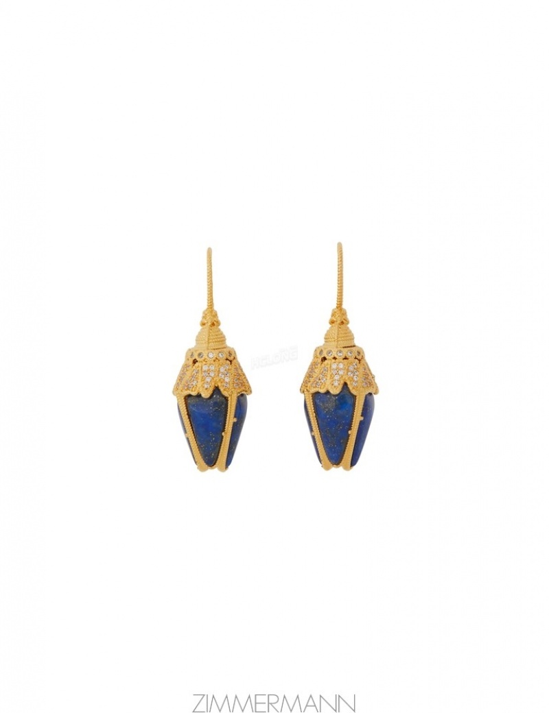 The Zimmermann Bloom Large Dangles in Gold/Lapis from our Resort 2024 Collection, Matchmaker. A gold plated drop earring featuring semi precious and cubic zirconia stones throughout.- 12KT gold plated brass
