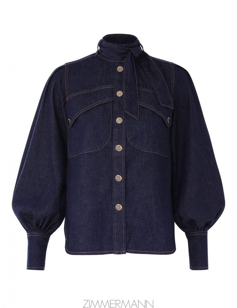 The Denim Pocket Shirt in Ink from our Spring 2024 Collection, Natura. A denim shirt featuring blouson sleeve, buttons down the centre front and a neck tie.- Classic shirt silhouette
