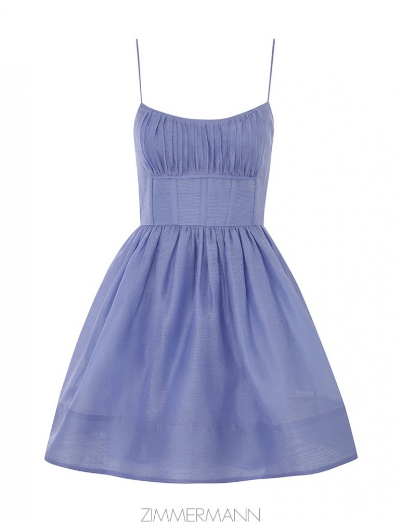 The Natura Ruched Mini Dress in Iris from our Spring 2024 Collection, Natura. A silk linen organza mini dress featuring shirred back bust, boning around bodice and side seam pockets.- Silk linen organza mini dress