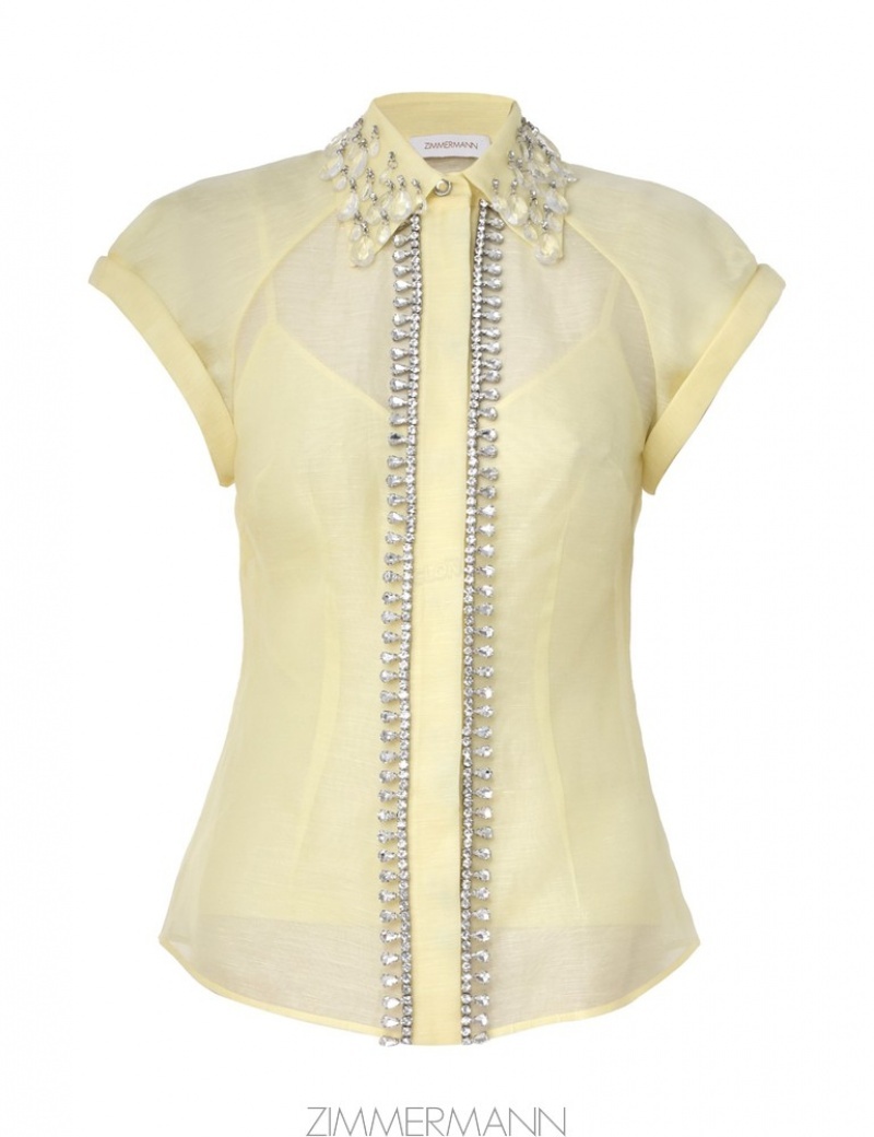The Matchmaker Diamante Blouse in Lemon from our Resort 2024 Collection, Matchmaker. A silk linen blouse featuring cuffed sleeves and crystal trims throughout.- Silk linen blouse