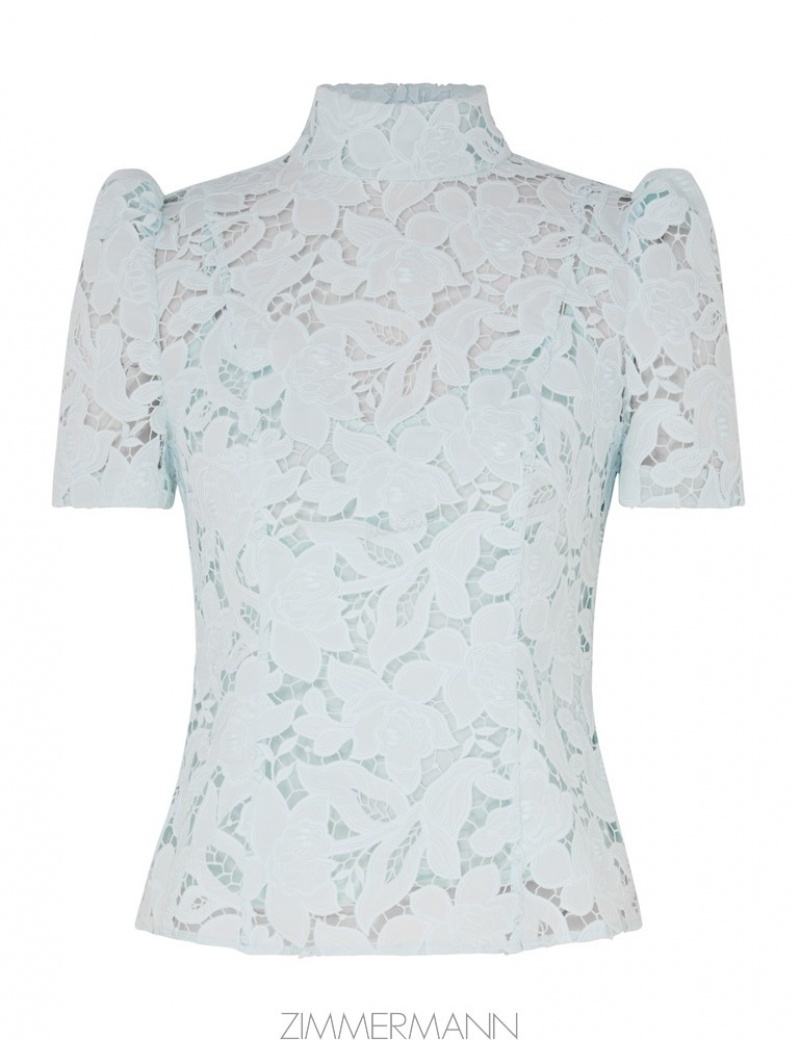 The Natura Lace Top in Mint from our Spring 2024 Collection, Natura. A lace top featuring a fitted silhouette, tulle sleeve head, organza inside collar and two way invisible zip.- Short sleeve lace top