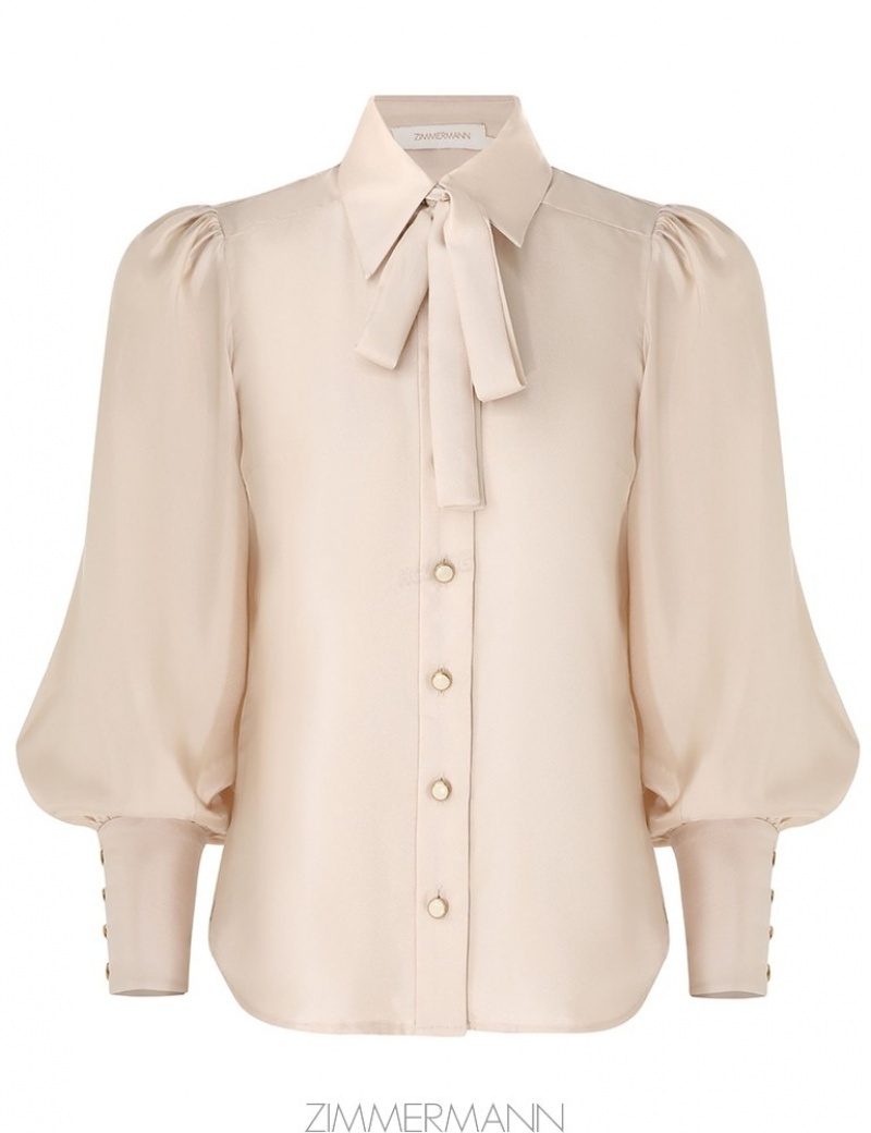 The Natura Blouson Shirt in Pearl from our Spring 2024 Collection, Natura. A silk shirt featuring a blouson sleeve, buttons down the centre front and a neck tie.- Classic shirt silhouette