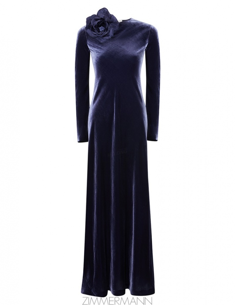 The Natura Velvet Bias Slip Dress in Navy from our Spring 2024 Collection, Natura. A velvet long sleeve dress featuring a bias sleeve hem and a statement flower brooch.- Velvet