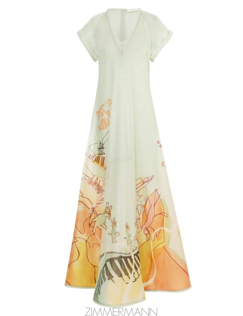The Matchmaker Poster V Neck Dress in Poster Print from our Resort 2024 Collection, Matchmaker. A silk linen organza maxi dress featuring raglan sleeves, a corded piping hem, and an invisible centre back opening.- Silk linen organza dress