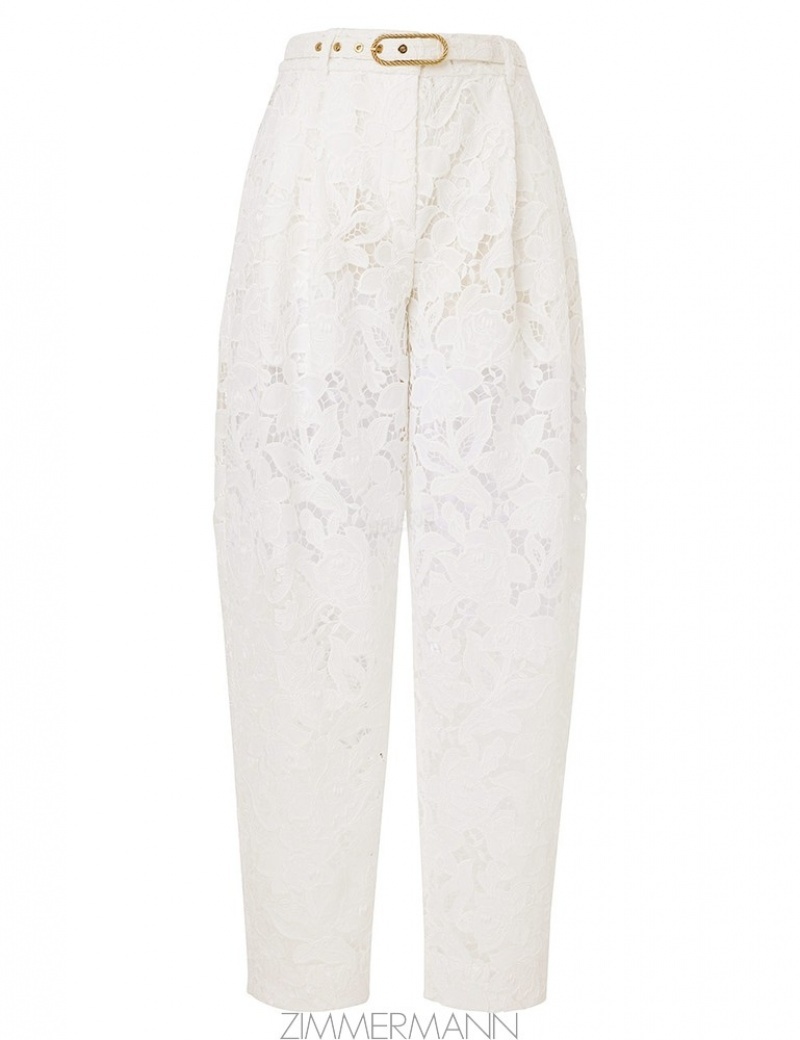 The Natura Cropped Barrel Pant in Ivory from our Spring 2024 Collection, Natura. A lace pant featuring double tuck on each side, centre front zip and a removable belt.- Lace pant