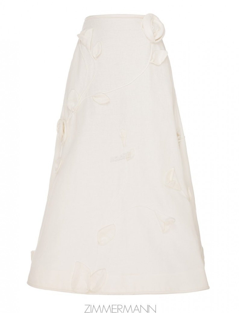 The Matchmaker Rose Flare Skirt in Ivory from our Resort 2024 Collection, Matchmaker. A linen midi skirt featuring rose applique throughout.- Linen midi skirt