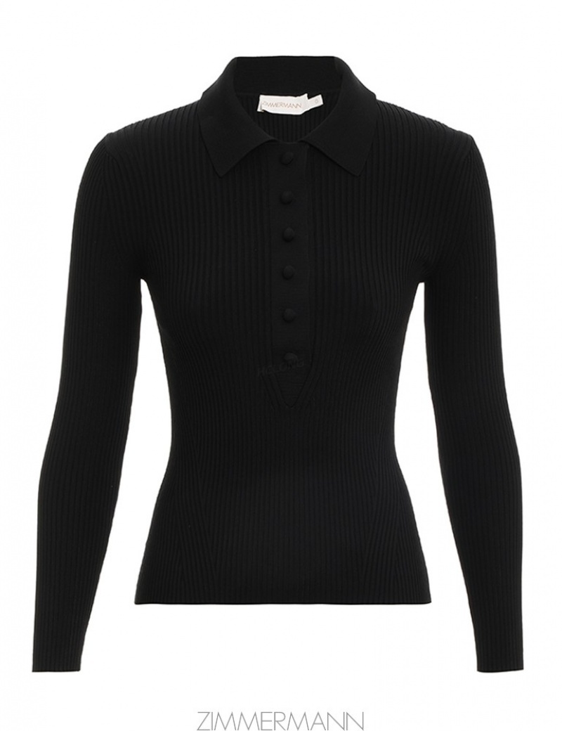 The Knit Polo Top in Black from our Spring 2024 Collection, Natura. A long sleeve knit polo featuring a three button closure.- Ribbed knit polo top