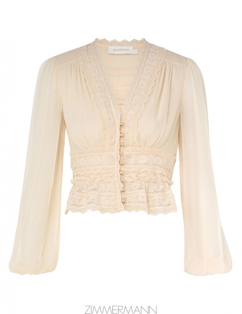 The Natura V Neck Button Bodice in Buff from our Spring 2024 Collection, Natura. A long sleeve bodice featuring a plunging v-neckline, frills around the waist and blouson sleeves.- V-neck bodice