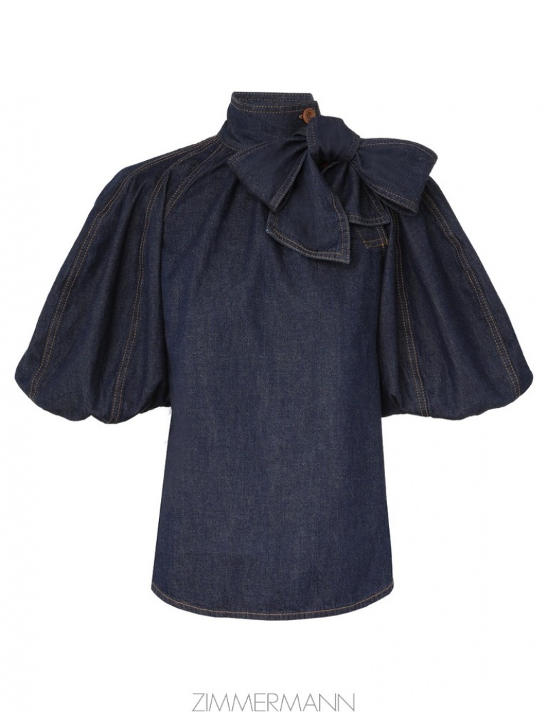 The Tie Neck Blouse in Ink from our Spring 2024 Collection, Natura. A denim blouse featuring cropped blouson sleeves and a self tie neck.- Denim blouse