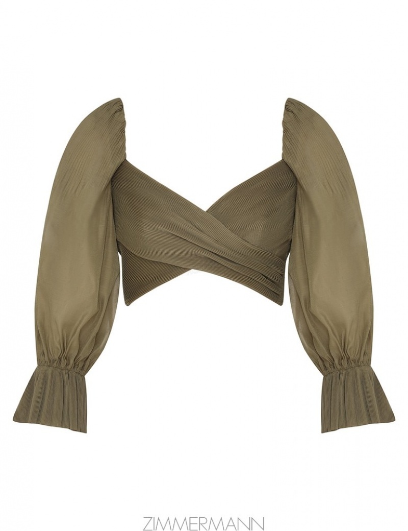 The Pleated Bodice in Olive from our Spring 2024 Collection, Natura. A cropped bodice featuring blouson sleeves with elasticated, fluted cuffs and pleating throughout.- Cropped bodice