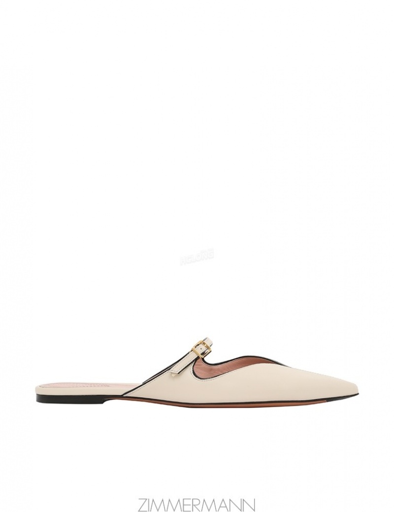 The Aura Mule 65 in Macadamia from our Resort 2024 Collection, Matchmaker. A leather mule featuring a pointed toe and gold hardware.- Leather mule