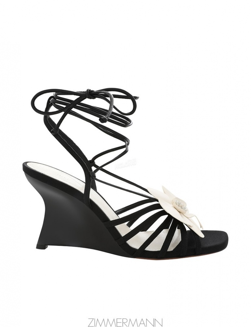 The Zimmermann Orchid Wedge 85 in Onyx from our Spring 2024 Collection, Natura. A leather wedge heel featuring a lace-up design with a removable orchid flower design.- Leather wedge sandal