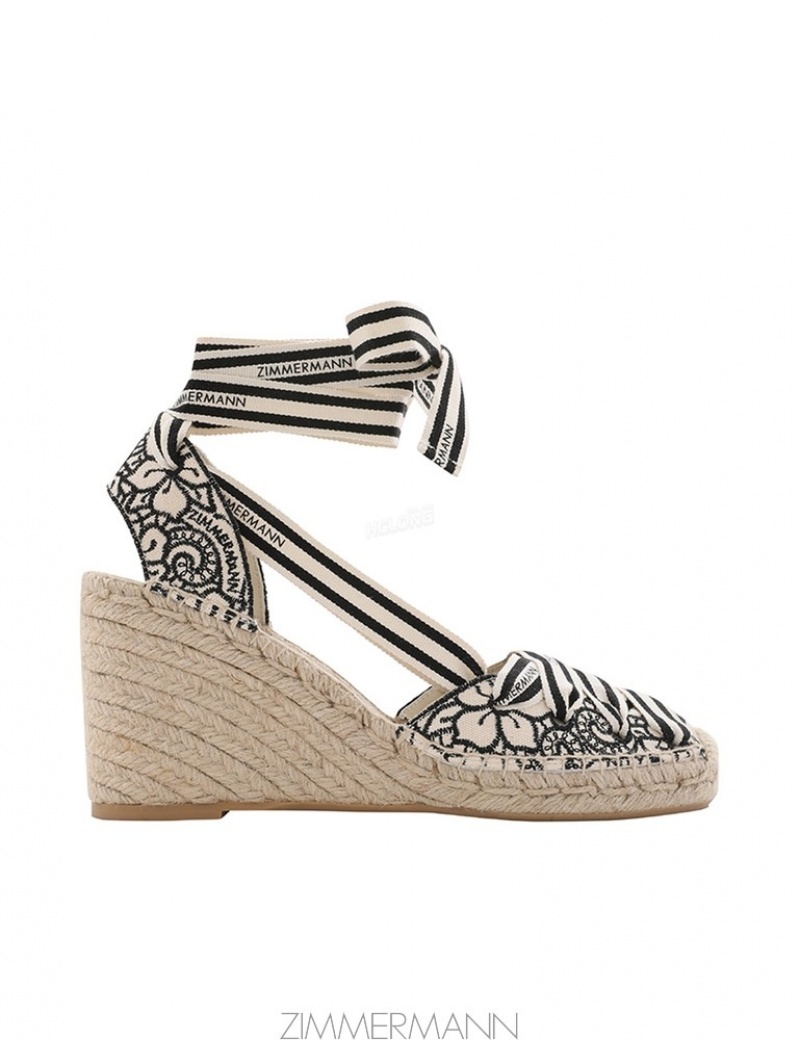 The Zimmermann Sol Espadrille 95 in Onyx from our Spring 2024 Collection, Natura. A wedge heel cotton espadrille featuring a stripe grosgrain ankle tie.- Made in Spain