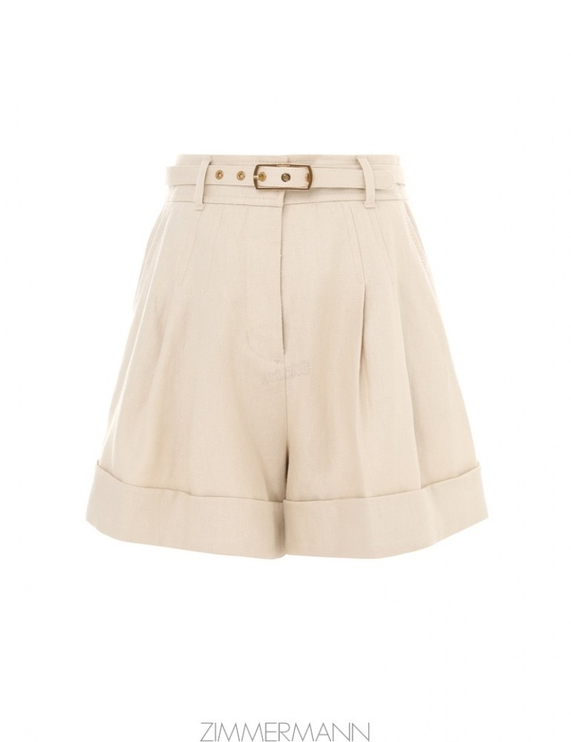 The Matchmaker Tuck Front Short in Straw from our Resort 2024 Collection, Matchmaker. A linen high waisted short featuring a wide waist band, angled pockets and a self covered skinny belt.- Linen high waist short